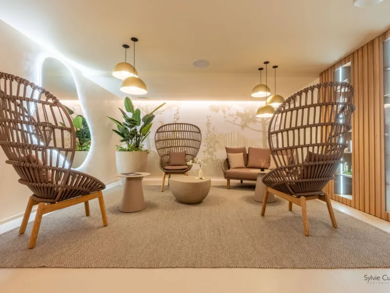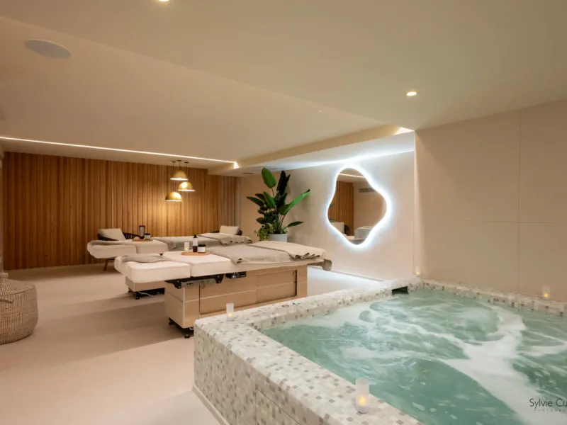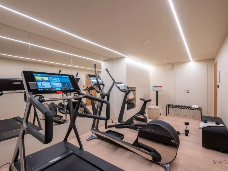 Relaxation area with massage tables, sauna and gym.