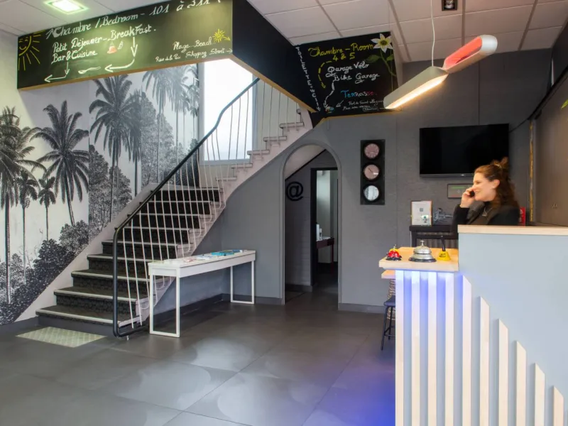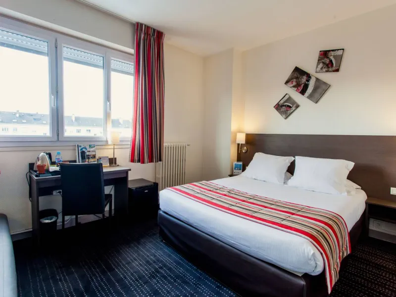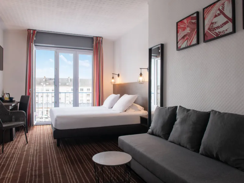 In the heart of « the city of 20 beaches » L’hôtel de l’Europe as an ideal location in the town center of Saint Nazaire between two shopping mall “le Ruban bleu” and “le Paquebot”.60 km away from Nantes Airport and 2 km only from the TGV train station, you will enjoy a historical city with Escal’Atlantique, the Espadon submarine and also famous industrial site such as Airbus and the Shipyard that built the “queen mary 2.