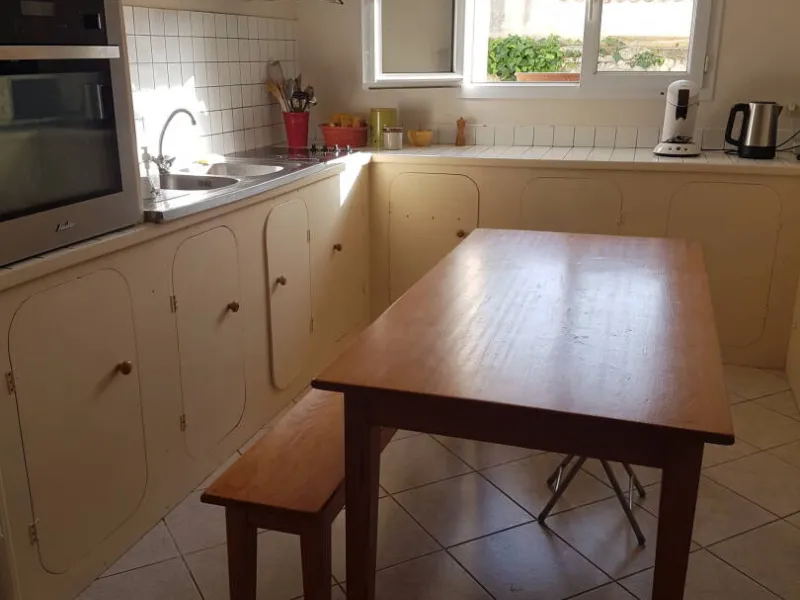 - cuisine avec plaque induction 3 foyers + hotte, micro-ondes, four, réfrigérateur congélateur N° 2, 2 cafetières filtre et Senceo, grille pain.