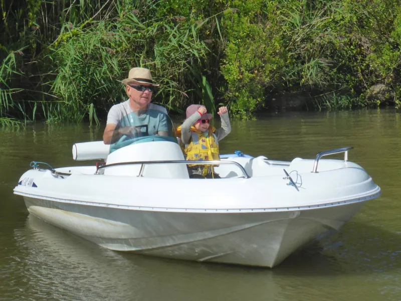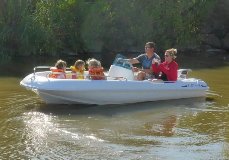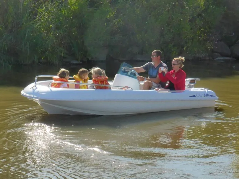 Ideal for a family outing, with up to five people aboard the electric boat. Steering couldn't be simpler. A tiller for steering and a button for speed. Your youngest will be happy to take the helm at your side, while your eldest, aged over twelve, can steer the boat on his own. Real sailors!For longer trips, you can travel in a Cap 400. More comfortable and better suited to adults and large families, it takes you out of the town and along the Jaunay dunes that lead to the main beach.